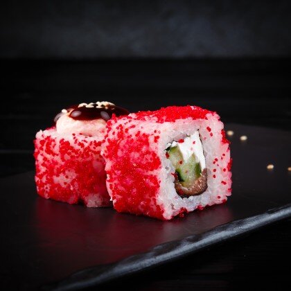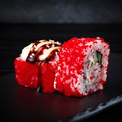 Рис, креветка, огурцы, тобика, спайси соус, нори. Поливается унаги соусом и посыпается кунжутом.